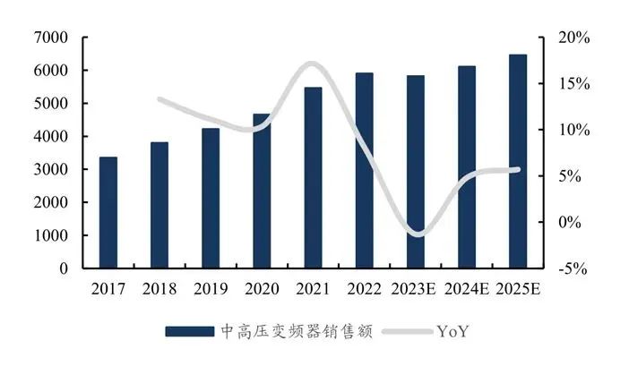 在中高壓變頻器市場(chǎng)中,2020年~2022年,我國(guó)中高壓變頻器市場(chǎng)規(guī)模同比增長(zhǎng)率分別達(dá)到了10%、17%和8%,年復(fù)合增長(zhǎng)率達(dá)到了13%,顯示出強(qiáng)勁的增長(zhǎng)動(dòng)力。
