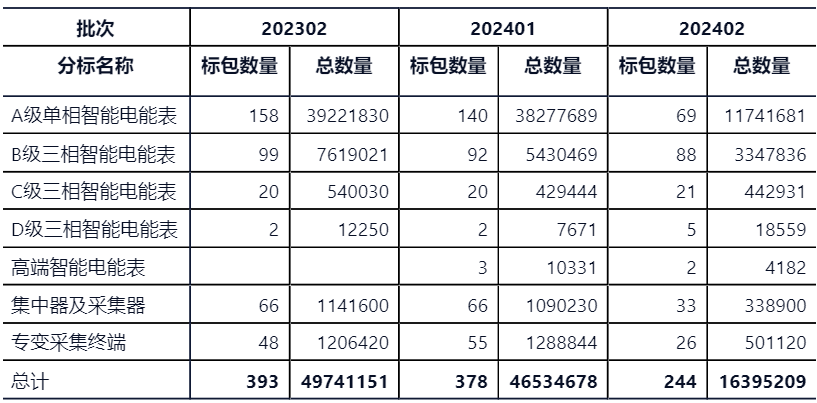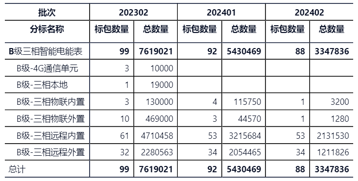 國網計量設備2024年第二批招標公告已發布,共7個分標,244個標包,單相電能表1174.17萬只、三相電能表381.35萬只(B334.78萬只、C44.29萬只、D1.85萬只、高端4182只)、集中器33.89萬只、專變50.11萬只(其中模組化專變1430只、專變III22.69萬只、專變II0.5萬只、專變I1.8萬只)。