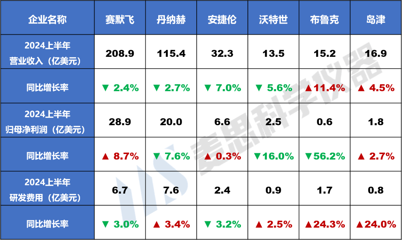 截至2024年8月,賽默飛、丹納赫、安捷倫、沃特世、布魯克和島津已發(fā)布2024上半年財務(wù)數(shù)據(jù)。重點財務(wù)數(shù)據(jù)如下: