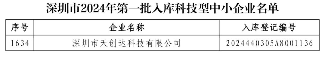 7月18日,深圳市工業(yè)和信息局發(fā)布了《工業(yè)和信息局關(guān)于深圳市2024年第一批擬入庫(kù)科技型中小企業(yè)名單的公示》,深圳市天創(chuàng)達(dá)科技有限公司位列其中。