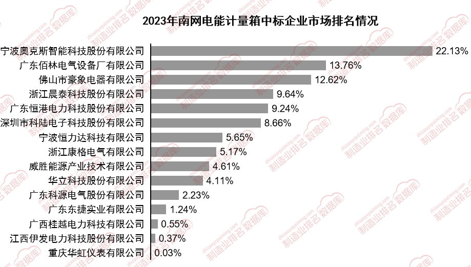 2023年度,南網(wǎng)范圍內(nèi)電能計量箱產(chǎn)品的招標市場總體規(guī)模約為5.4億元,共有15家企業(yè)中標。在這些企業(yè)中,寧波奧克斯智能科技股份有限公司中標金額最大,約為1.2億元元,占比約22.1%。其次,是廣東佰林電氣設(shè)備廠有限公司和佛山市豪象電器有限公司,中標金額分別為74.6百萬元和68.4百萬元,占比分別為13.8%和12.6%。整體來看,南網(wǎng)電能計量箱產(chǎn)品市場的供應(yīng)商整體較為集中。