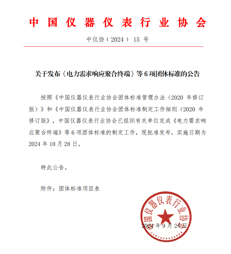 近日,根據(jù)《中國儀器儀表行業(yè)協(xié)會(huì)團(tuán)體標(biāo)準(zhǔn)管理辦法》的規(guī)定,中國儀器儀表行業(yè)協(xié)會(huì)(簡稱“協(xié)會(huì)”)組織完成了由協(xié)會(huì)電工儀器儀表分會(huì)提出的《電力需求響應(yīng)聚合終端》等4項(xiàng)、試驗(yàn)儀器分會(huì)提出的《溫差電器件致冷性能測試方法》等2項(xiàng)團(tuán)體標(biāo)準(zhǔn)的制定工作,現(xiàn)予以發(fā)布,特此公告。