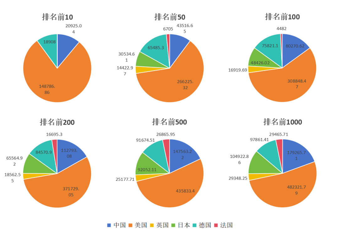 在平均研發投入總額上,中國科技領軍企業表現出了與前兩者截然相反的統計特征。在排名前10的分段中,憑借著華為這一家科技領軍企業,中國的平均研發投入水平占據了約三分之一的比例,略遜于美國。而隨著分段的逐漸向后擴大,中國科技領軍企業所占比例逐漸下降,在排名前1000的分段中其所占比例甚至位于六國之末。