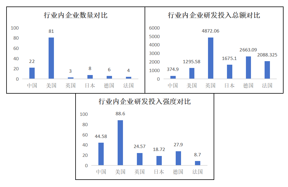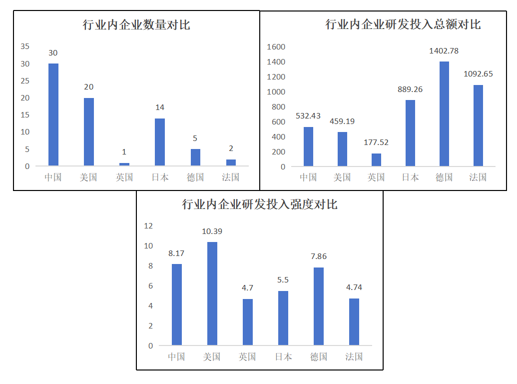 四是汽車和零部件行業上,中國科技領軍企業的數量優勢并不明顯;其平均研發投入總額僅略高于英國,處于較低的水平;其平均研發投入強度則大約處于中等偏上的水平??傊袊萍碱I軍企業在汽車和零部件行業上的發展比較一般,體量優勢不明顯,創新水平不高;在平均研發投入總額較低的情況下卻有著較高的平均研發投入強度,更是說明了我國汽車和零部件行業的營收情況不容樂觀。
