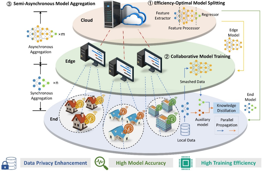 目前市場化的智能電表產品僅具備電能計量和雙向通訊的功能。如果智能電表能夠在本地對收集的海量數據進行智能分析處理,電力系統可以在無需額外投資的情況下提高能源管理效率、降低用戶電力消費、以及緩解云平臺計算壓力。然而,智能電表的內存、計算和通信硬件資源和數據資源有限,難以支撐復雜的神經網絡訓練任務。為此,該論文通過結合聯邦學習和分割學習,提出了一種創新的云-邊-端架構,有效解決了智能電表在硬件資源和數據資源方面的雙重限制的問題。