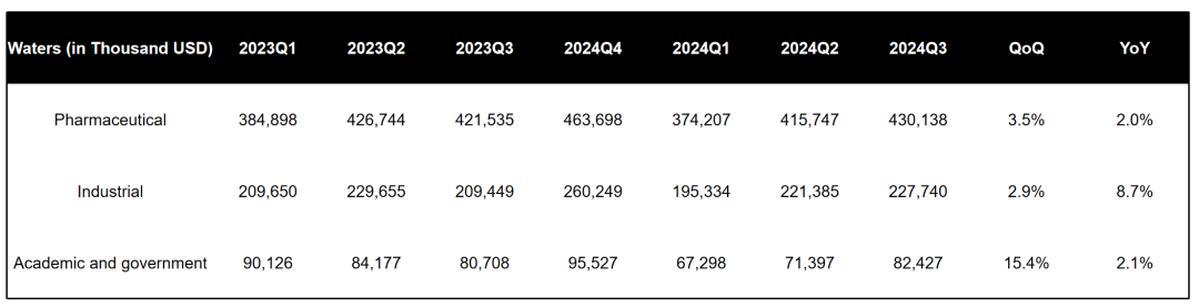 Waters2024Q3財報顯示,公司本季度營收7.40億美元,超過此前指引,同比增長4%。凈利潤1.615億美元,同比大增20%。值得注意的是,根據(jù)Waters財報,2024Q1/Q2期營收均同比下滑,尤其是Q1更是大幅下降。