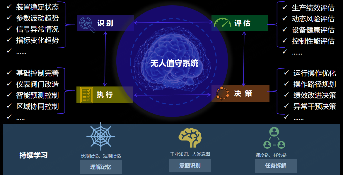 “無人”值守能夠?qū)⑵髽I(yè)較為稀缺的人力資源從復(fù)雜、繁瑣、重復(fù)的操作活動中解放出來,提升裝置運(yùn)行水平、安全水平和效益,減少非計劃停工,對裝置的長周期、高效自主運(yùn)行具有深遠(yuǎn)意義,是化工裝置“安、穩(wěn)、長、滿、優(yōu)”高度自主運(yùn)行的集中體現(xiàn)。區(qū)別于傳統(tǒng)的“黑屏操作”,“無人”值守的關(guān)鍵在于裝置系統(tǒng)能夠具備“識別-評估-決策-執(zhí)行”的自主能力,實(shí)現(xiàn)對外部的需求或干擾進(jìn)行自主響應(yīng),同時又可對系統(tǒng)內(nèi)部要素的完整性、健康性、穩(wěn)定性進(jìn)行自我管理,最終達(dá)到無需人工干預(yù)、實(shí)現(xiàn)無人值守的目標(biāo)。