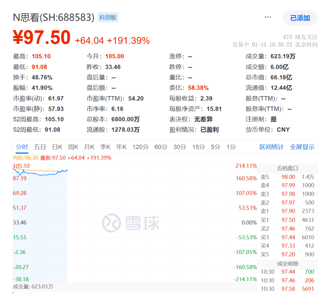 上市首日,思看科技開盤價(jià)為105元/股,高開213.81%,市值一度超70億元。截至上午10時(shí)30分,思看科技股價(jià)報(bào)97.5元/股,漲191.39%,市值超66億元。