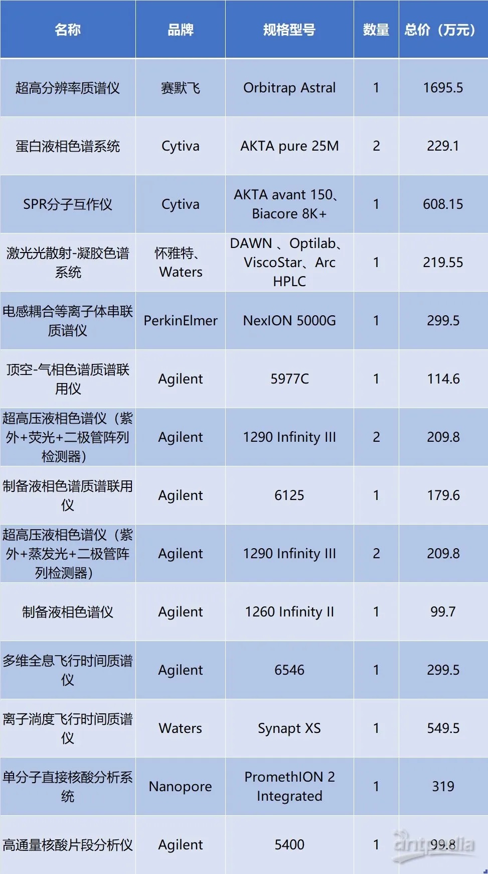 湖北中醫(yī)藥大學(xué)近日購置一批重大科研設(shè)備,其中,部分招標(biāo)項(xiàng)目已經(jīng)開標(biāo)。這些已開標(biāo)的儀器設(shè)備包括超高分辨率質(zhì)譜儀、蛋白液相色譜系統(tǒng)、SPR分子互作儀、飛行時(shí)間質(zhì)譜儀等,中標(biāo)的品牌有賽默飛、Cytiva、Waters、Agilent、PerkinElmer和Nanopore,此批次總中標(biāo)(成交)金額為5133.1萬元。