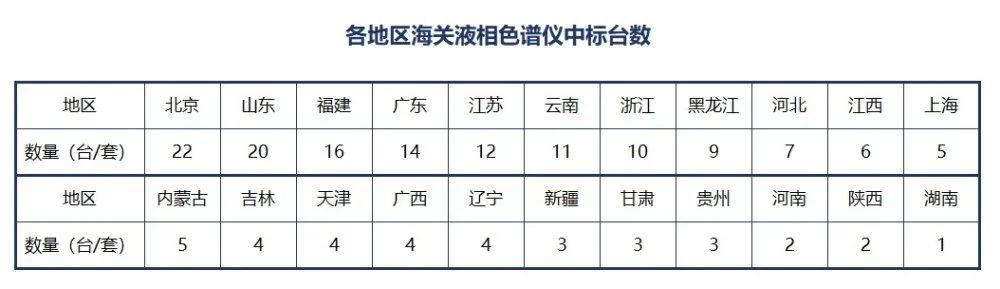 截至2024年12月31日,依據(jù)中國(guó)政府采購(gòu)網(wǎng)公開(kāi)信息不完全統(tǒng)計(jì),在已公布的中標(biāo)結(jié)果中,全國(guó)22個(gè)省、直轄市、自治區(qū)的海關(guān)相關(guān)單位完成了液相色譜儀采購(gòu)中標(biāo)工作。此次共中標(biāo)167臺(tái)(套)液相色譜儀,總中標(biāo)(成交)金額超8562萬(wàn)元人民幣,共有11家品牌成功中標(biāo)。