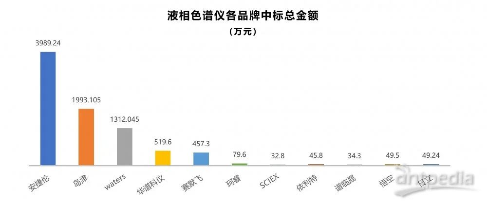 從總金額來(lái)看,安捷倫以3989.24萬(wàn)元位居首位,占整體中標(biāo)金額的47.6%;島津(1993.105萬(wàn)元)、Waters(1312.045萬(wàn)元)、華譜科儀(519.6萬(wàn)元)和賽默飛(457.3萬(wàn)元)分列二至五位。值得一提的是華譜科儀,其以中標(biāo)總金額519.6萬(wàn)元排名第四,在本次海關(guān)設(shè)備更新的液相色譜招標(biāo)中,堪稱一匹黑馬。