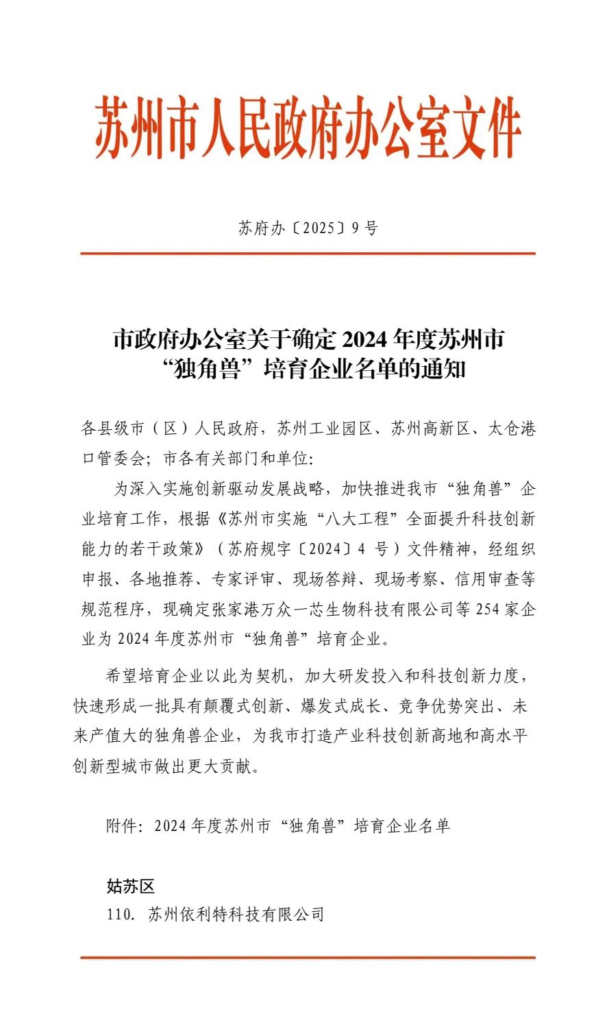 2025年2月11日,蘇州——近日,蘇州市政府正式發(fā)布《2024年度蘇州市“獨(dú)角獸”培育企業(yè)名單》,蘇州依利特科技有限公司作為姑蘇區(qū)首家且唯一入選企業(yè),成功躋身這一具有戰(zhàn)略意義的創(chuàng)新梯隊(duì)。這一里程碑式突破,標(biāo)志著姑蘇區(qū)在培育高成長(zhǎng)性科技企業(yè)、構(gòu)建現(xiàn)代化產(chǎn)業(yè)體系方面取得重要進(jìn)展。