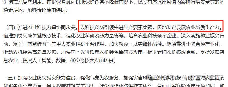 尤其值得關注的是,本次中央一號文件首次提出“農(nóng)業(yè)新質生產(chǎn)力”概念,明確要推進農(nóng)業(yè)科技力量協(xié)同攻關: