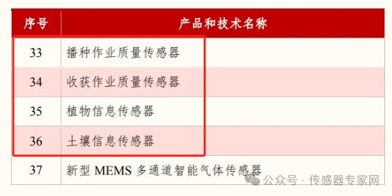 《目錄》儀器儀表領域中,基礎零部件和元器件共計37種,其中傳感器20種,有4種農(nóng)業(yè)傳感器被“點名”列入,分別是:播種作業(yè)資料傳感器、收獲作業(yè)資料傳感器、植物信息傳感器、土壤信息傳感器。