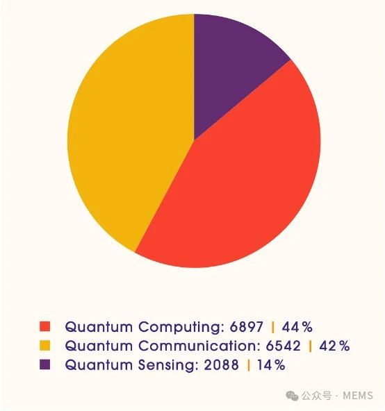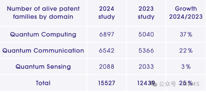 2024年,量子計算和量子通信領域的專利族占比明顯高于量子傳感,三者的占比分別為44%42%14%。從2023年~2024年的增長率來看,量子計算和量子通信領域的專利增長也顯著高于量子傳感領域,三者的增長率分別為37%、22%3%。反映了當前全球量子技術領域的發展熱點和重點方向。