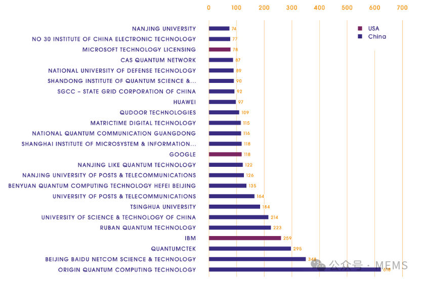 在中國申請的量子技術專利按申請量排名,前25位專利申請人中,除了三家來自美國的申請人(IBM、谷歌和微軟),其他全部為中國本土機構,包括本源量子計算科技(合肥)股份有限公司、北京百度網訊科技有限公司、科大國盾量子技術股份有限公司、如班量子科技有限公司、中國科學技術大學、清華大學、北京郵電大學及南京郵電大學等。