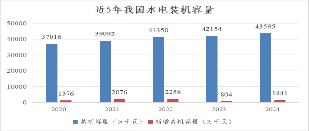 水電作為常規(guī)電力中唯一的可再生能源,2024年總體呈現(xiàn)出穩(wěn)定增長的發(fā)展趨勢,并且在全球范圍內(nèi)保持領(lǐng)先地位。截至當(dāng)年底,我國水電總裝機容量達到4.36億千瓦,占我國電力總裝機的13.02%,較2023年新增裝機容量1378萬千瓦,同比增長3.2%,其中,常規(guī)水電裝機規(guī)模3.77億千瓦、同比增加625萬千瓦;抽水蓄能裝機規(guī)模5869萬千瓦、同比增加753萬千瓦。全年水電發(fā)電量14239億千瓦時,占發(fā)電總量的13.53%,僅次于火電,排在第2位;規(guī)模以上水電年平均利用小時數(shù)為3349小時。在雙碳目標和新能源快速發(fā)展的大背景下,水電以其穩(wěn)定、清潔的特點,成為我國清潔能源供應(yīng)的可靠保證。