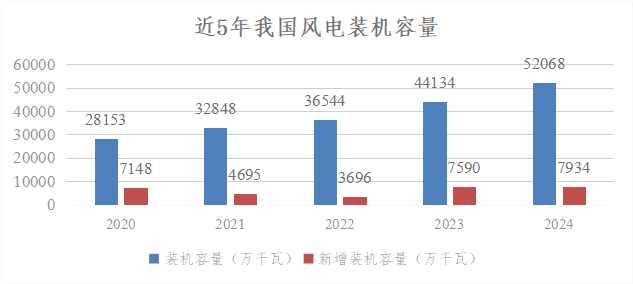 截至2024年末,全國風(fēng)電累計并網(wǎng)容量達到5.21億千瓦,同比增長18%,其中陸上風(fēng)電4.8億千瓦,海上風(fēng)電4127萬千瓦,在全國電力裝機中排在第3位。全年新增裝機容量7982萬千瓦,同比增長6%,其中陸上風(fēng)電7579萬千瓦,海上風(fēng)電404萬千瓦。從新增裝機分布看,“三北”地區(qū)占全國新增裝機的75%。2024年,全國風(fēng)電發(fā)電量9916億千瓦時,同比增長16%,僅次于火電和水電,排在第3位;全年并網(wǎng)發(fā)電利用小時數(shù)為2127小時,平均上網(wǎng)利用率95.9%。