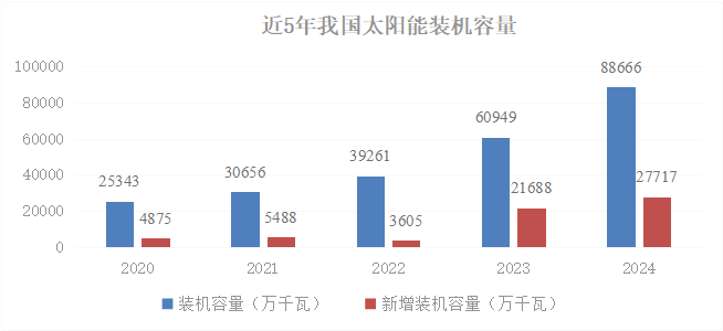 截至2024年末,全國光伏發(fā)電裝機容量達8.86億千瓦,同比增長45%,排在火電之后,位居第2位,其中集中式光伏5.11億千瓦,分布式光伏3.75億千瓦。全年光伏新增裝機2.78億千瓦,同比增長28%,其中集中式光伏1.59億千瓦,分布式光伏1.18億千瓦。全年光伏發(fā)電量達到8341億千瓦時,同比增長44%,但仍落后于核電的發(fā)電量,排在第5位。全年發(fā)電利用小時數(shù)為1211小時,發(fā)電上網(wǎng)利用率96.8%,較上年有所降低。