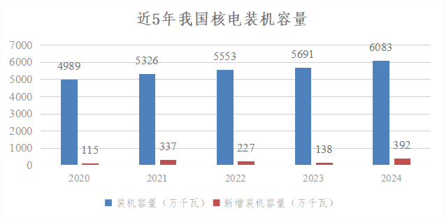 2024年是我國核電發(fā)展具有里程碑的一年,全年新核準11臺核電機組,為歷年核準數(shù)量之最,連續(xù)3年核準機組數(shù)量超過10臺;投入運行核電機組2臺,新增額定裝機規(guī)模240萬千瓦;在運、在建和核準待建核電機組共有102臺,總裝機容量1.13億千瓦,連續(xù)2年位居全球首位。截至當(dāng)年末,全國運行核電機組共有57臺(不含臺灣地區(qū)),額定裝機容量為5943.17萬千瓦。全年累計核電發(fā)電量為4451.75億千瓦時,比上年同期上升了2.72%,占全國累計發(fā)電量的4.73%,超過太陽能發(fā)電量,排在第4位。由此可見,我國核電裝機占全國總裝機的比例不到2%,但發(fā)出的電量接近全國總發(fā)電量的5%。年設(shè)備利用小時數(shù)為7805.74小時,平均機組能力因子為90.26%。