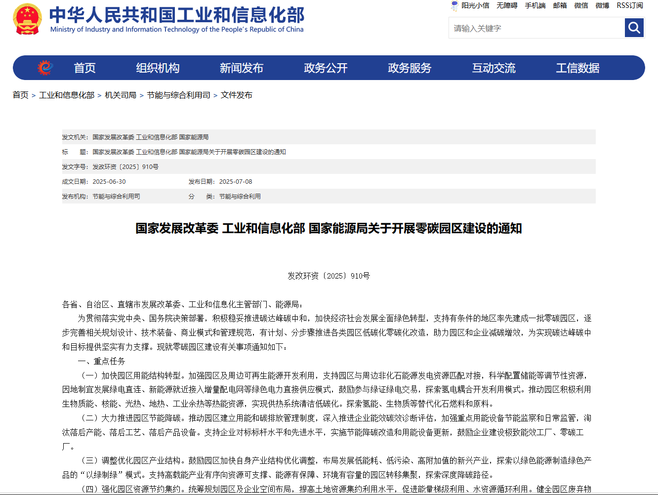 《開展零碳園區建設的通知》通知(部分截圖)