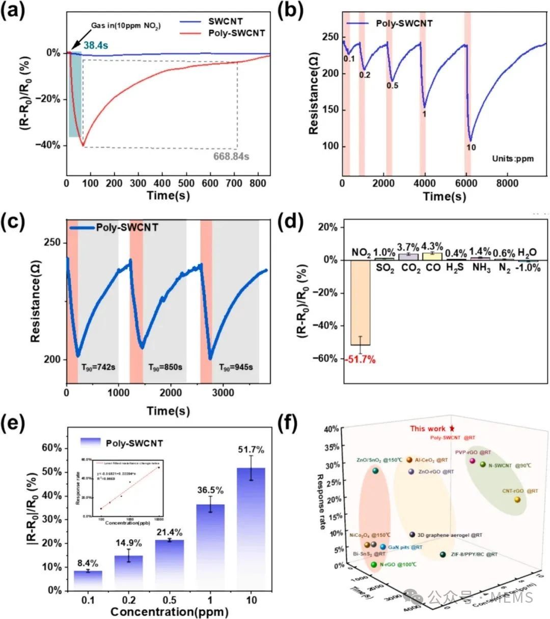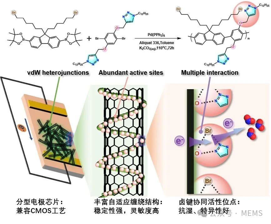 近日,中國科學(xué)院上海微系統(tǒng)所程建功團(tuán)隊(duì)成功研發(fā)出一種高特異性、室溫工作的NO2傳感器。該氣體傳感器依托一種新型交替共軛聚合物,與碳納米管自適應(yīng)纏繞為剛?cè)岵?jì)的骨架結(jié)構(gòu),形成特異性鹵鍵側(cè)鏈協(xié)同作用位點(diǎn),實(shí)現(xiàn)對NO2分子的精準(zhǔn)捕獲與感知。室溫下檢測下限達(dá)到1.8 ppb,并具有優(yōu)異的選擇性和環(huán)境穩(wěn)定性,適用于智能建筑、工業(yè)廠房、環(huán)境監(jiān)測站等多場景NO2氣體檢測。