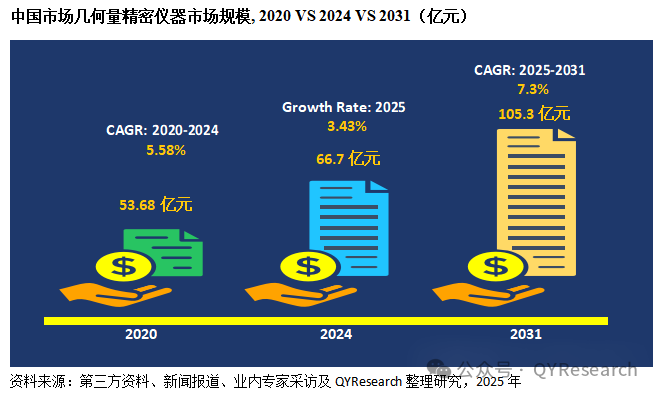 幾何量精密儀器是指用于測量物體長度、角度、形狀、位置、輪廓、形位誤差等幾何參數(shù)的高精度測量設備,是計量測試領域的基礎儀器之一,在工業(yè)生產、國家計量等領域具有重要作用。根據研究團隊調研統(tǒng)計,中國市場在過去幾年變化較快,2024年中國幾何量精密儀器市場銷售額達到了66.7億元,預計2031年將達到105.3億元,年復合增長率(CAGR)為7.3%(2025-2031)。