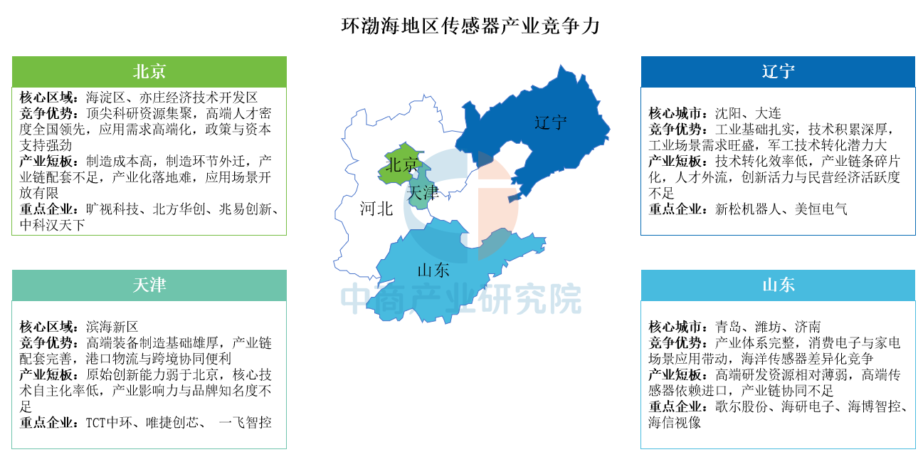 環渤海地區傳感器產業主要分布于北京、天津、遼寧及山東四大核心區域,各地依托差異化優勢布局:北京以頂尖科研資源、高端人才及政策資本為支撐,但面臨制造成本高、產業鏈配套不足等短板;天津憑借高端裝備制造基礎與港口物流優勢發展,但原始創新能力較弱;遼寧依托扎實工業基礎與軍工技術轉化潛力,存在技術轉化效率低、人才外流等問題;山東則憑借完整產業體系與消費電子、海洋傳感器特色應用場景發展,但高端研發資源薄弱且依賴進口。
