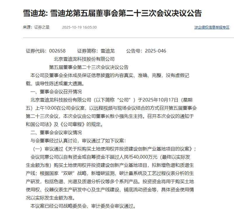 10月19日晚間,北京雪迪龍科技股份有限公司(股票代碼:002658)發布一則重磅公告,擬投資不超過4億元,購買位于北京市昌平區的國有建設用地使用權并建設包括色譜和質譜生產線的創新產業基地項目。