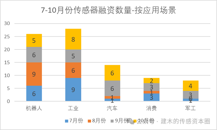 從融資數(shù)量上看,工業(yè)、汽車、機(jī)器人數(shù)量居于前三位,分別是8家、6家、5家,合計(jì)占比80%。本月機(jī)器人數(shù)量略有下滑,汽車領(lǐng)域的傳感器融資數(shù)量明顯恢復(fù)。