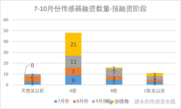 2025年7-10月份傳感器行業(yè)的融資數(shù)量和輪次統(tǒng)計(jì)如下。2025年7-10月共有85起融資案例,分別為20、17、22、25起融資,融資數(shù)量相對比較穩(wěn)定,平均每月20起左右。
