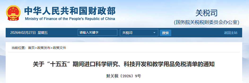 根據(jù)《財政部 海關總署 稅務總局關于“十五五”期間支持科技創(chuàng)新進口稅收優(yōu)惠政策的通知》(財關稅〔2026〕7號)和《財政部 中央宣傳部 國家發(fā)展改革委 教育部 科技部 工業(yè)和信息化部 民政部 商務部 文化和旅游部 國家衛(wèi)生健康委 海關總署 稅務總局關于“十五五”期間支持科技創(chuàng)新進口稅收優(yōu)惠政策管理辦法的通知》(財關稅〔2026〕8號)有關規(guī)定,現(xiàn)將“十五五”期間進口科學研究、科技開發(fā)和教學用品免稅清單(見附件)予以公布,自2026年1月1日起實施。