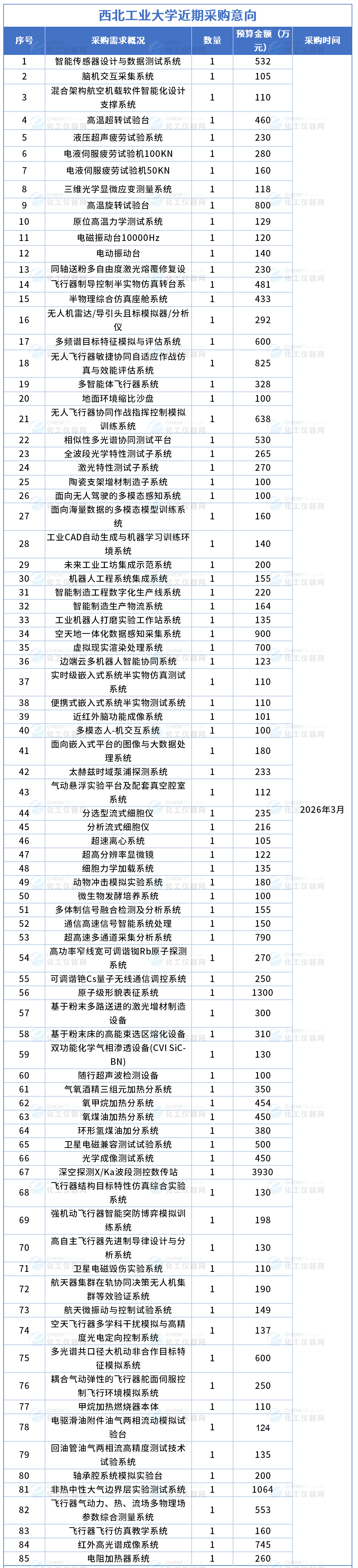 近期,西北工業(yè)大學(xué)發(fā)布近期多項(xiàng)儀器采購意向,總金額28826萬元,涉及儀器設(shè)備包括分選型流式細(xì)胞儀、分析流式細(xì)胞儀、超速離心系統(tǒng)、超高分辨率顯微鏡、細(xì)胞力學(xué)加載系統(tǒng)、動物沖擊模擬實(shí)驗(yàn)系統(tǒng)、微生物發(fā)酵培養(yǎng)系統(tǒng)、多體制信號融合檢測及分析系統(tǒng)、通信高速信號智能系統(tǒng)處理、超高速多通道采集分析系統(tǒng)等,預(yù)計(jì)采購時(shí)間2026年3月。