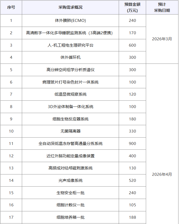 近期,上海臨床研究中心發布多項儀器采購意向,計劃采購高分辨空間組學分析質譜儀、低溫顯微觀察系統、細胞生物反應器系統、生物安全柜、細胞計數儀、二氧化碳細胞培養搖床、倒置熒光顯微鏡、超低溫冰箱等儀器設備,預算總金額15513.1萬元。預計采購時間20263~5月。