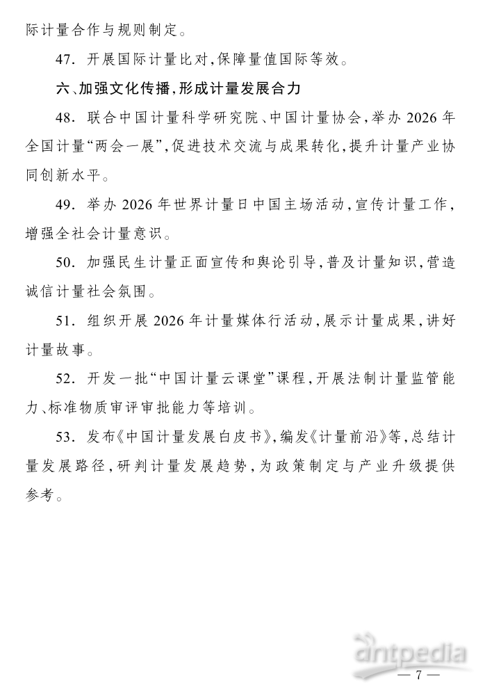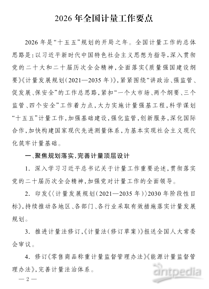 2026年,全國計量工作主要圍繞六個方面開展:聚焦規劃落實,完善計量頂層設計;加強基礎建設,提升計量保障能力;創新監管模式,守牢計量公正底線;圍繞戰略需求,優化計量服務支撐;深化國際合作,推動計量高水平對外開放;加強文化傳播,形成計量發展合力。具體包括推進計量法修訂,圍繞新技術、新產業、新業態建設一批計量技術委員會等內容。