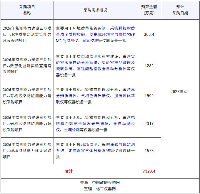 近期,江西省生態(tài)環(huán)境監(jiān)測中心發(fā)布“江西省生態(tài)環(huán)境監(jiān)測中心2026年度政府采購意向公告(第2批)”,計(jì)劃采購便攜式環(huán)境空氣顆粒物(PM2.5)監(jiān)測儀、實(shí)驗(yàn)室水質(zhì)自動分析系統(tǒng)、高分辨質(zhì)譜儀、氣相色譜質(zhì)譜儀、加壓流體萃取儀、電感耦合等離子體發(fā)光光譜儀、全自動測汞儀等大批環(huán)境監(jiān)測設(shè)備,預(yù)算總金額7523.4萬元。預(yù)計(jì)采購時(shí)間2026年4月。