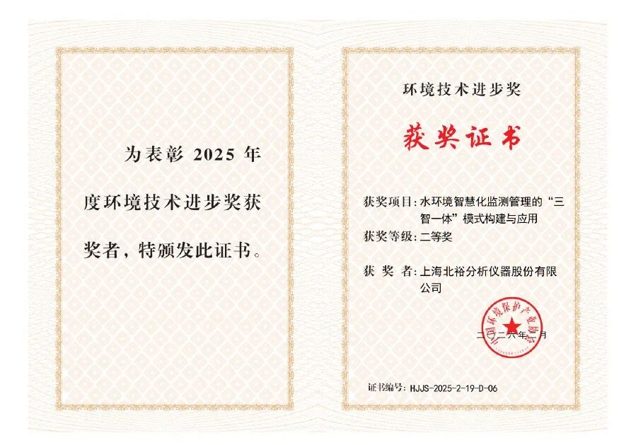 近日,上海北裕分析儀器股份有限公司在環(huán)保科技領(lǐng)域捷報頻傳,先后榮獲中國環(huán)境保護產(chǎn)業(yè)協(xié)會2025年度環(huán)境技術(shù)進步獎二等獎,與廣東省環(huán)境保護產(chǎn)業(yè)協(xié)會2025年度科學技術(shù)獎(環(huán)境技術(shù)進步獎)一等獎。兩項殊榮既是對北裕儀器創(chuàng)新成果的肯定,也充分體現(xiàn)了各方合作單位協(xié)同攻關(guān)、共同推動水環(huán)境監(jiān)測技術(shù)進步的重要成效。