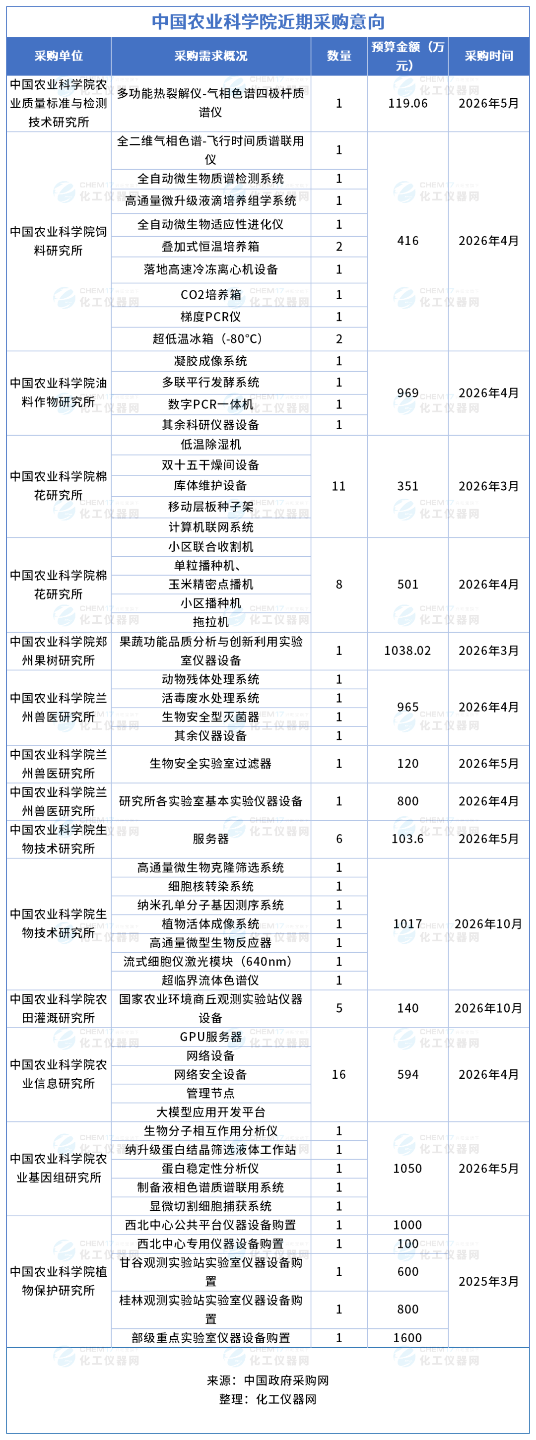 近期,中國農(nóng)業(yè)科學(xué)院各院所發(fā)布多項儀器采購意向,采購預(yù)算金額12283.68萬元,涉及儀器設(shè)備包括多功能熱裂解儀-氣相色譜四極桿質(zhì)譜儀、全二維氣相色譜-飛行時間質(zhì)譜聯(lián)用儀、全自動微生物質(zhì)譜檢測系統(tǒng)、高通量微升級液滴培養(yǎng)組學(xué)系統(tǒng)、全自動微生物適應(yīng)性進化儀、疊加式恒溫培養(yǎng)箱、落地高速冷凍離心機設(shè)備等。預(yù)計采購時間2026年3月-10月。
