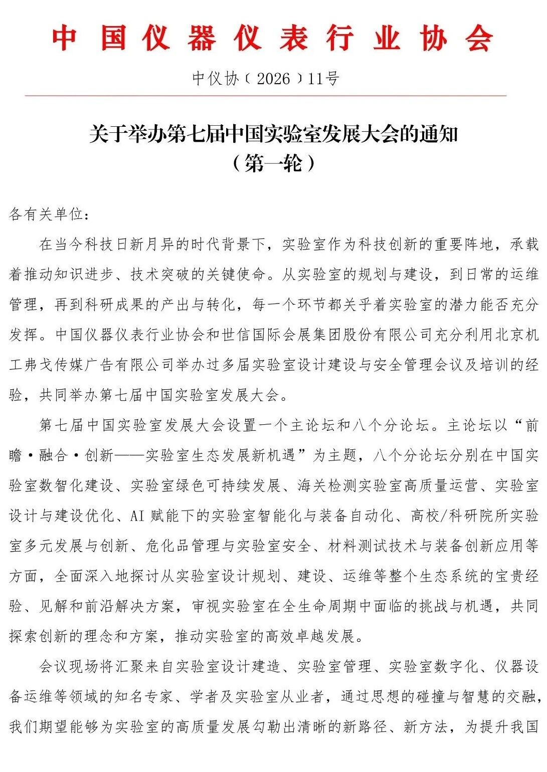 在當(dāng)今科技日新月異的時代背景下,實驗室作為科技創(chuàng)新的重要陣地,承載著推動知識進(jìn)步、技術(shù)突破的關(guān)鍵使命。從實驗室的規(guī)劃與建設(shè),到日常的運維管理,再到科研成果的產(chǎn)出與轉(zhuǎn)化,每一個環(huán)節(jié)都關(guān)乎著實驗室的潛力能否充分發(fā)揮。由中國儀器儀表行業(yè)協(xié)會和世信國際會展集團(tuán)股主辦的第七屆中國實驗室發(fā)展大會將于2026年5月29-30日在國家會議中心二期舉辦!誠摯邀請業(yè)界同仁相聚北京,共襄盛舉!