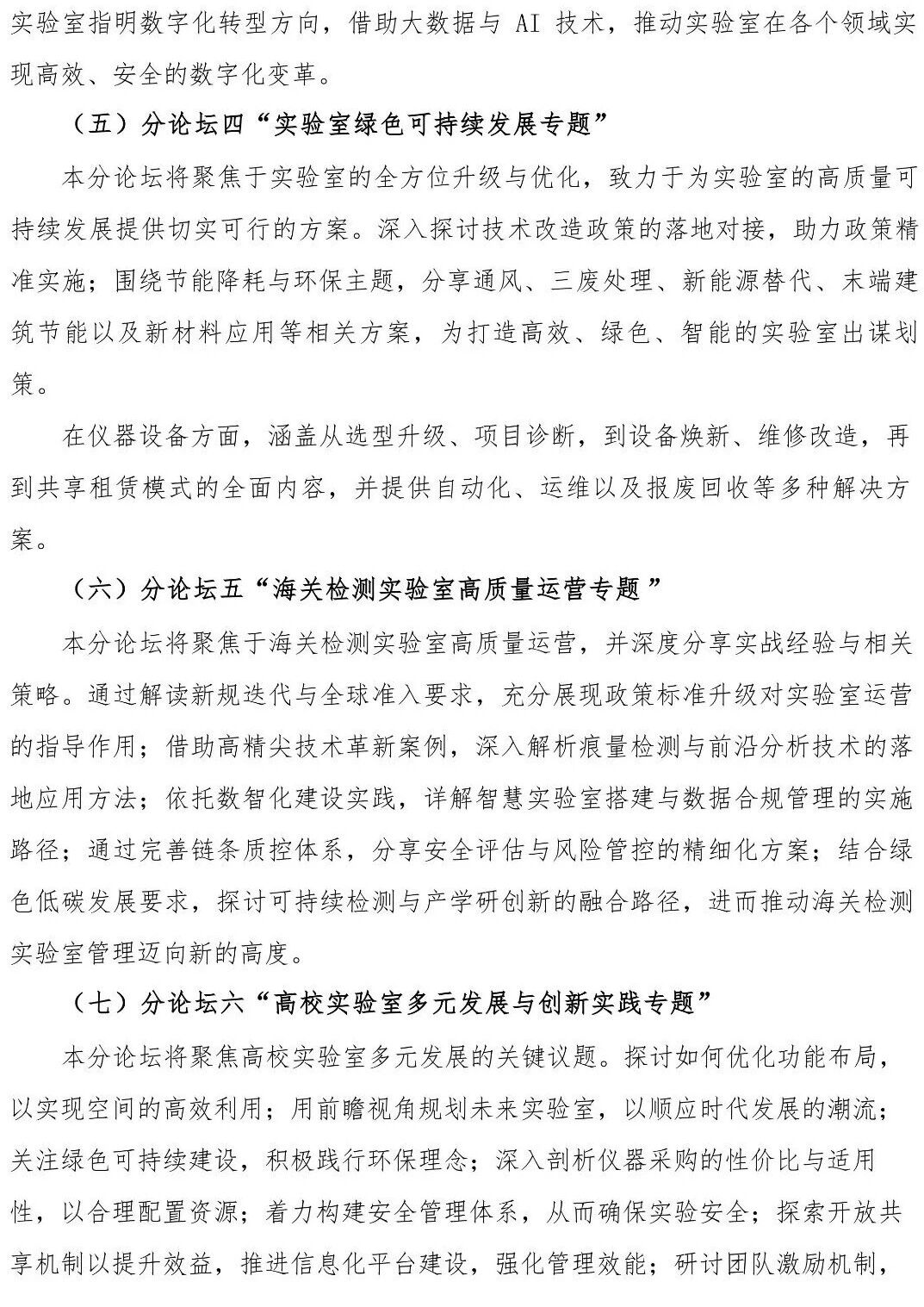第七屆中國實驗室發(fā)展大會設(shè)置一個主論壇和八個分論壇。主論壇以“前瞻・融合・創(chuàng)新——實驗室生態(tài)發(fā)展新機(jī)遇”為主題,八個分論壇分別在實驗室綠色可持續(xù)發(fā)展、海關(guān)檢測實驗室高質(zhì)量運營、實驗室設(shè)計建設(shè)與優(yōu)化、AI賦能下的實驗室智能化與裝備自動化、高校/科研院所實驗室多元發(fā)展與創(chuàng)新、危化品管理與實驗室安全、中國實驗室數(shù)智化建設(shè)、材料測試技術(shù)與裝備創(chuàng)新應(yīng)用等方面,全面深入地探討從實驗室設(shè)計規(guī)劃、建設(shè)、運維等整個生態(tài)系統(tǒng)的寶貴經(jīng)驗、見解和前沿解決方案,審視實驗室在全生命周期中面臨的挑戰(zhàn)與機(jī)遇,共同探索創(chuàng)新的理念和方案,推動實驗室的高效卓越發(fā)展。