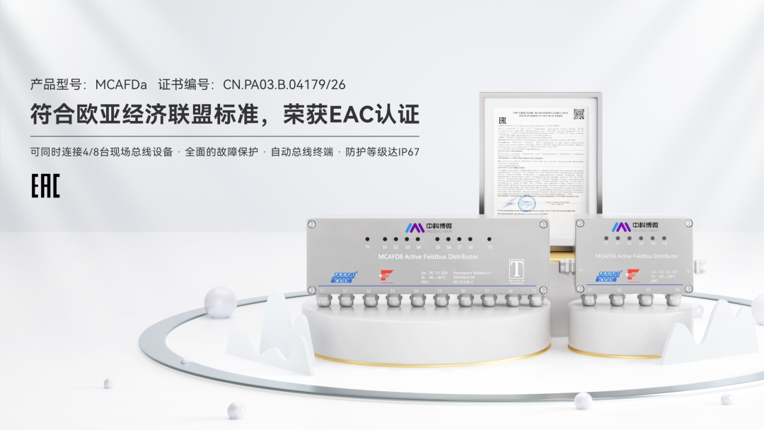 EAC認證的獲得,不僅是對MCAFD系列產品性能與品質的權威認可,更是中科博微拓展國際市場的重要里程碑。未來,中科博微將持續深耕工業自動化領域,以優質產品與核心技術,穩步開拓歐亞市場,為全球客戶提供更可靠、高效的現場總線解決方案,助力工業領域高質量發展。