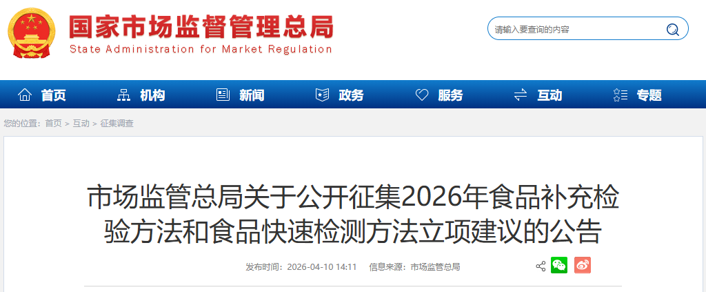 市場監(jiān)管總局關(guān)于公開征集2026年食品補(bǔ)充檢驗(yàn)方法