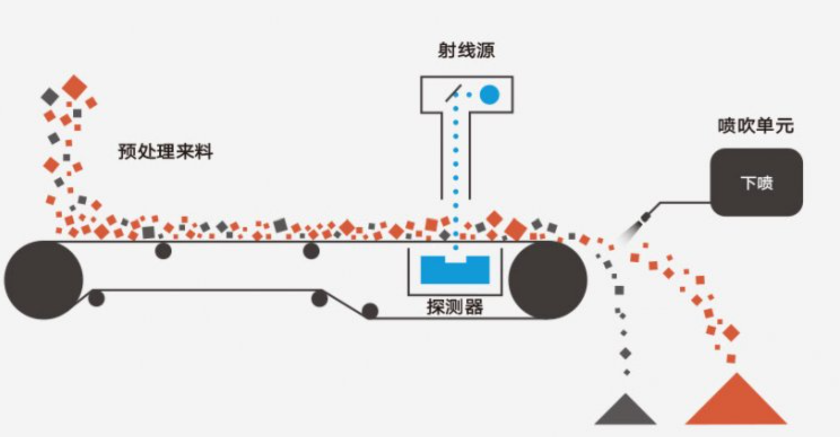 霍里思特的核心產(chǎn)品是基于X射線透視成像和AI識(shí)別算法的智能分選機(jī)。設(shè)備通過X射線探測(cè)器獲取礦石內(nèi)部結(jié)構(gòu)特征,結(jié)合AI算法識(shí)別廢石與有用礦石,最后用氣排槍實(shí)現(xiàn)精準(zhǔn)分離。整個(gè)過程無(wú)需用水,可大幅減少后續(xù)磨礦、浮選環(huán)節(jié)的無(wú)用功和藥劑消耗。