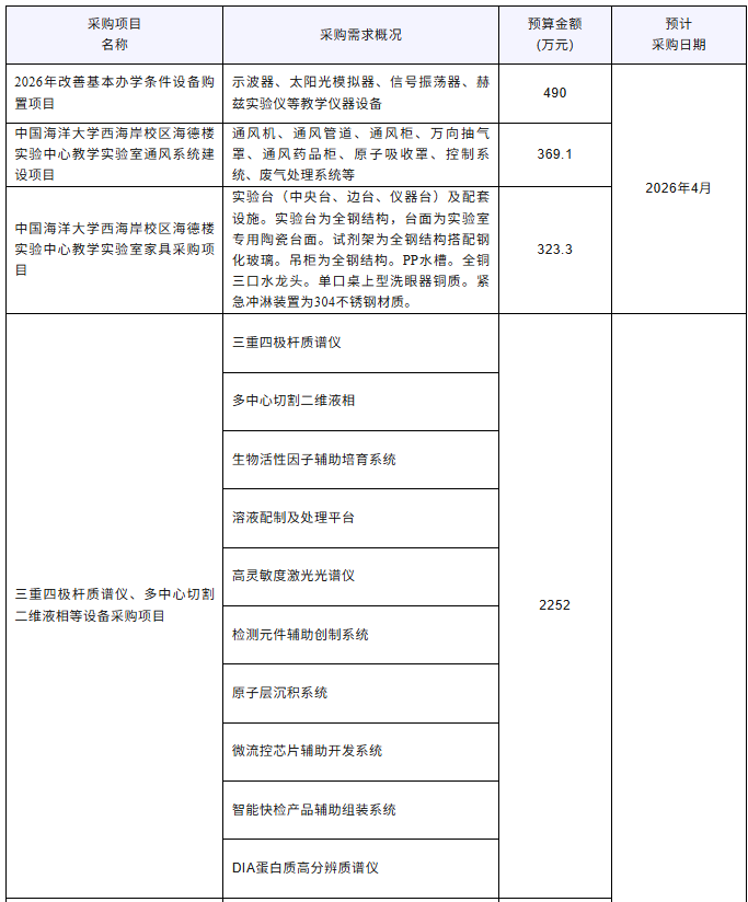 近期,中國海洋大學(xué)發(fā)布多項(xiàng)儀器采購意向,計(jì)劃采購三重四極桿質(zhì)譜儀、高靈敏度激光光譜儀、原子層沉積系統(tǒng)、DIA蛋白質(zhì)高分辨質(zhì)譜儀、真空帶式連續(xù)干燥機(jī)、石英晶體微天平、X射線衍射儀、研究級偏光顯微鏡等儀器設(shè)備,預(yù)算總金額11275萬元。預(yù)計(jì)采購時間2026年4月~6月。