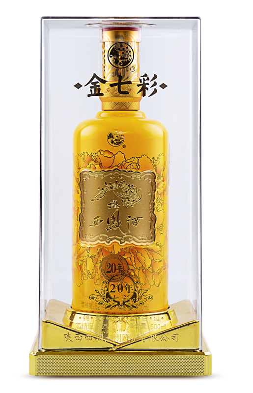金七彩20年,高級質感透明亞克力材質外盒,其瓶身通體金黃,搭配燙金品牌標志印花,有種近似黃金的閃耀、華貴。